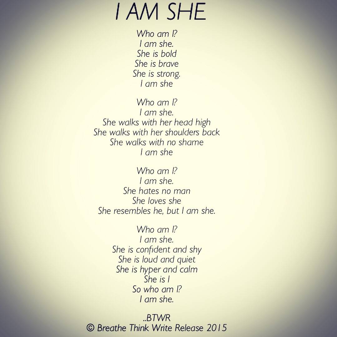 Who Am I? I AM SHE Image ~ January 8, 2016January 31, 2016 ~ Breathe Think Write Release Spread The Love Click to share on WhatsApp (Opens in new window) WhatsApp Tweet Click to email a link to a friend (Opens in new window) Email Share on Tumblr Click to share on Reddit (Opens in new window) Reddit More Click to print (Opens in new window) Print PocketLike Loading... Related