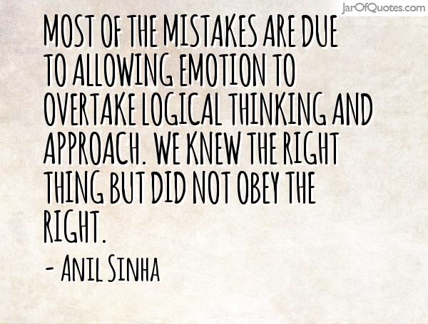 Logically thinking is the best way to be, but we struggle to think logically when we allow our emotions to take centre stage. Logic deals with facts whereas emotional thinking is usually based on assumption. There’s no reasoning with emotions.